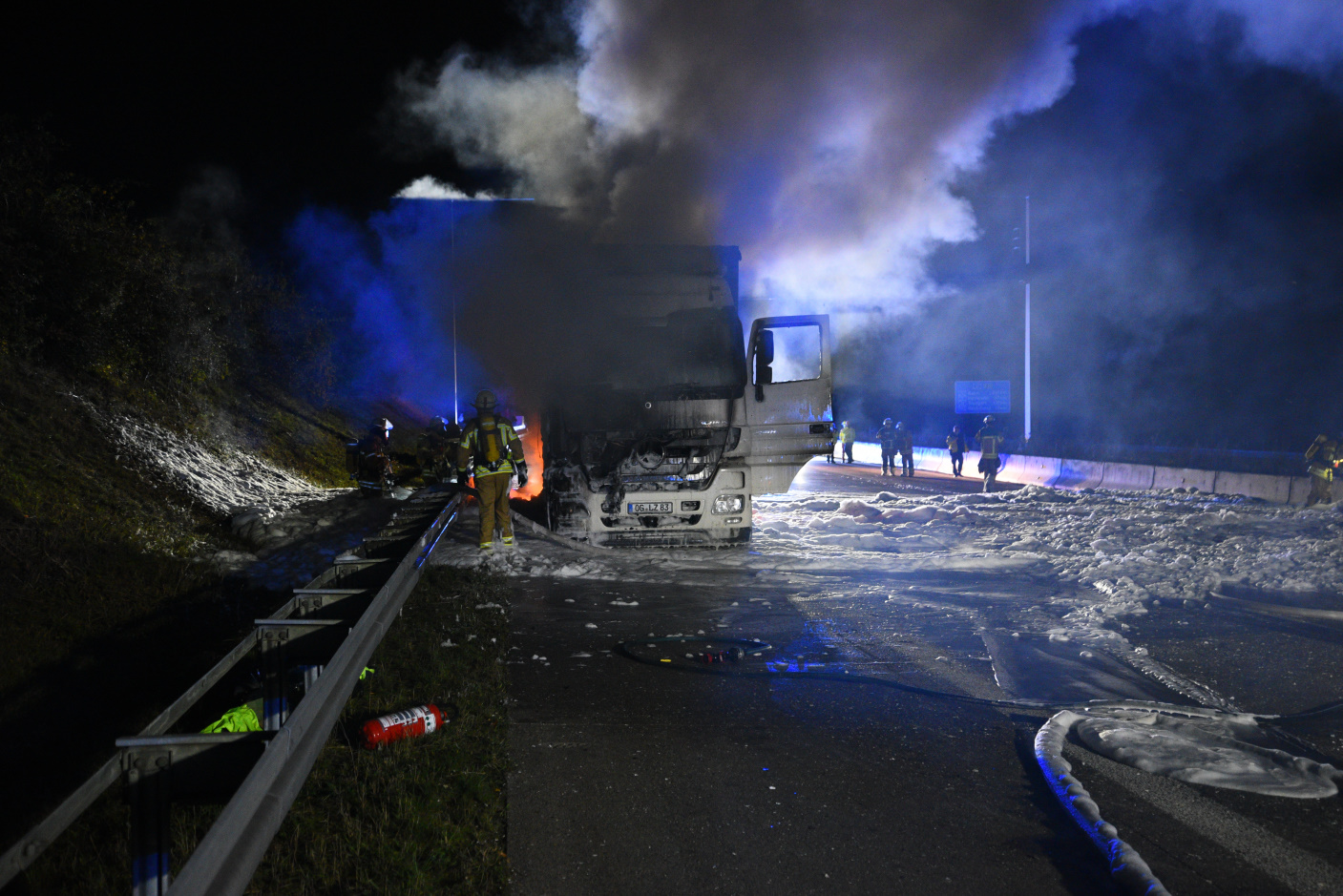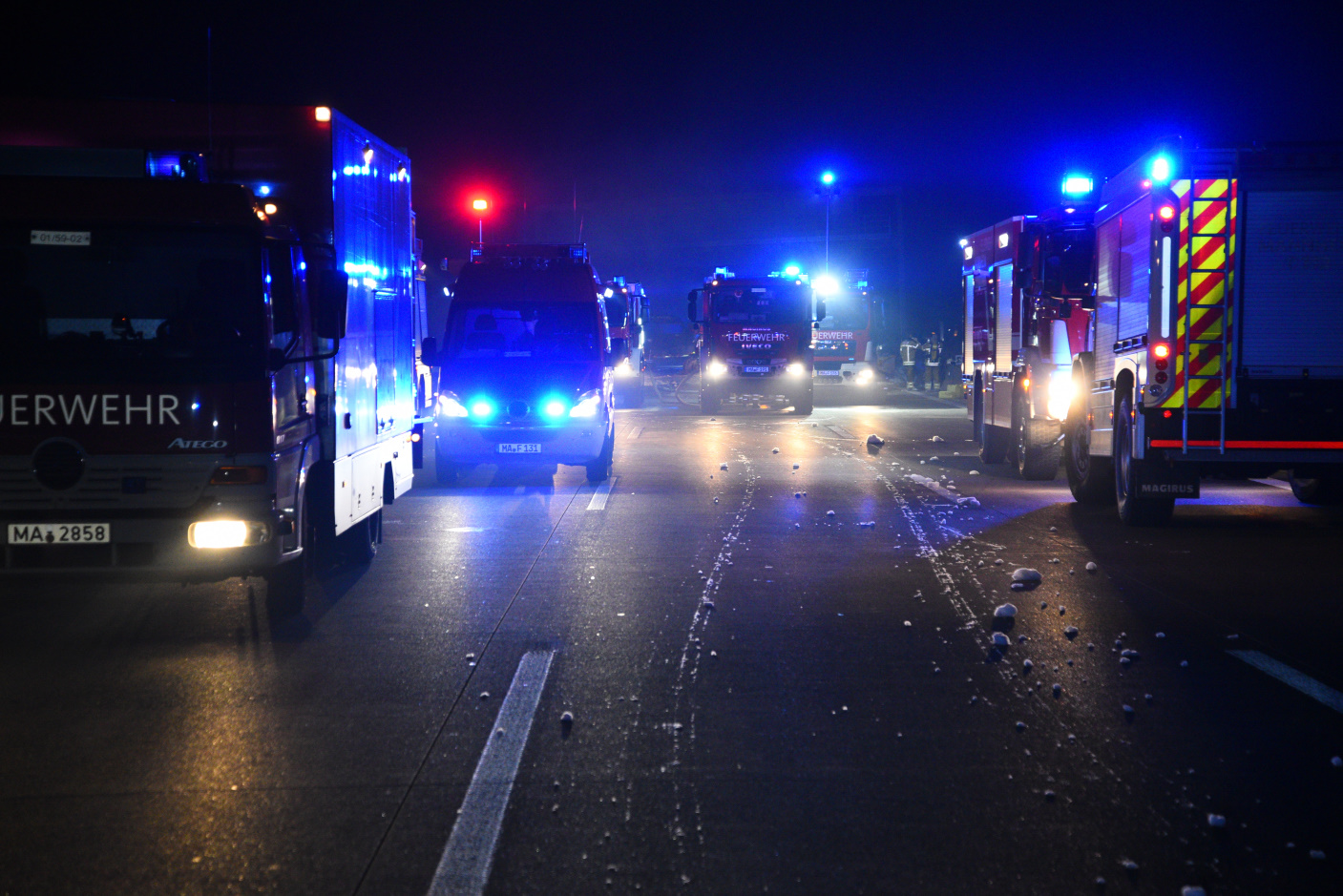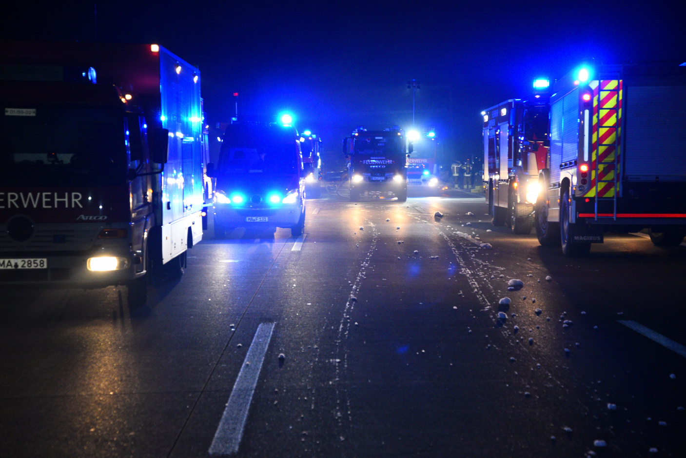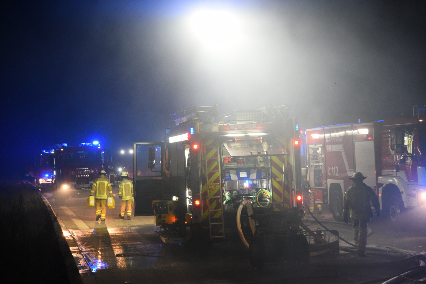 Stand 20.17 Uhr: Kurz vor 18 Uhr meldeten mehrere Verkehrsteilnehmer einen brennenden LKW auf der A6 auf dem Standstreifen zwischen dem Kreuz Mannheim und dem Viernheimer Kreuz. Nach ersten Erkenntnissen geriet das Fahrzeug im Bereich des Führerhauses während der Fahrt in Brand und griff dann auf den Anhänger über. Als der Fahrer des LKWs dies bemerkt hatte, hielt er sofort an. Da er Rauchgas einatmete befindet er sich derzeit vorsorglich in medizinischer Behandlung. Die Berufsfeuerwehr Mannheim, Rettungsdienst und Polizei sind mit einem Großaufgebot vor Ort. Es kommt nach wie vor zu starker Rauchentwicklung. Die Fahrbahnen zwischen den Autobahnkreuzen Mannheim und Viernheim sind zwecks Nachlösch-und Aufräumarbeiten weiterhin in beide Richtungen voll gesperrt. Die Brandursache ist derzeit noch unklar. Es kommt zu Rückstau in beiden Richtungen.