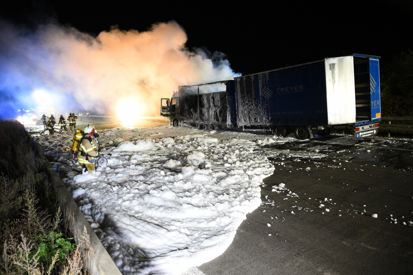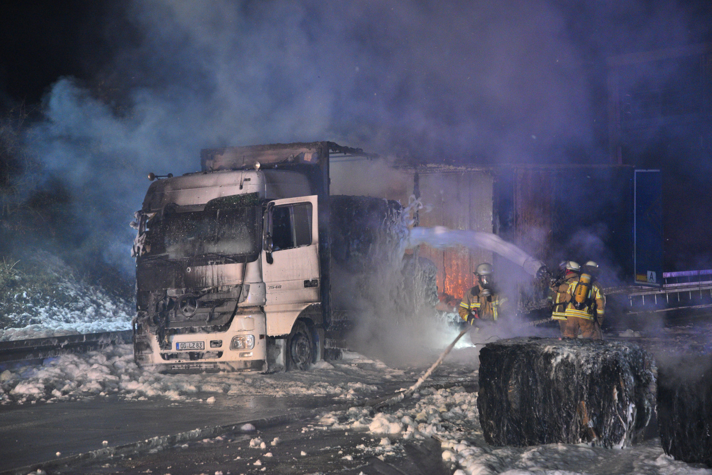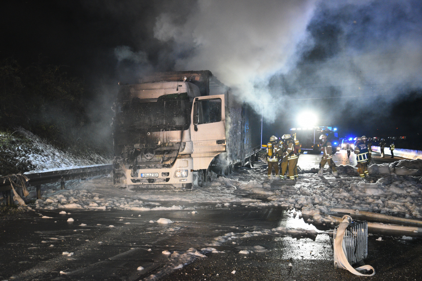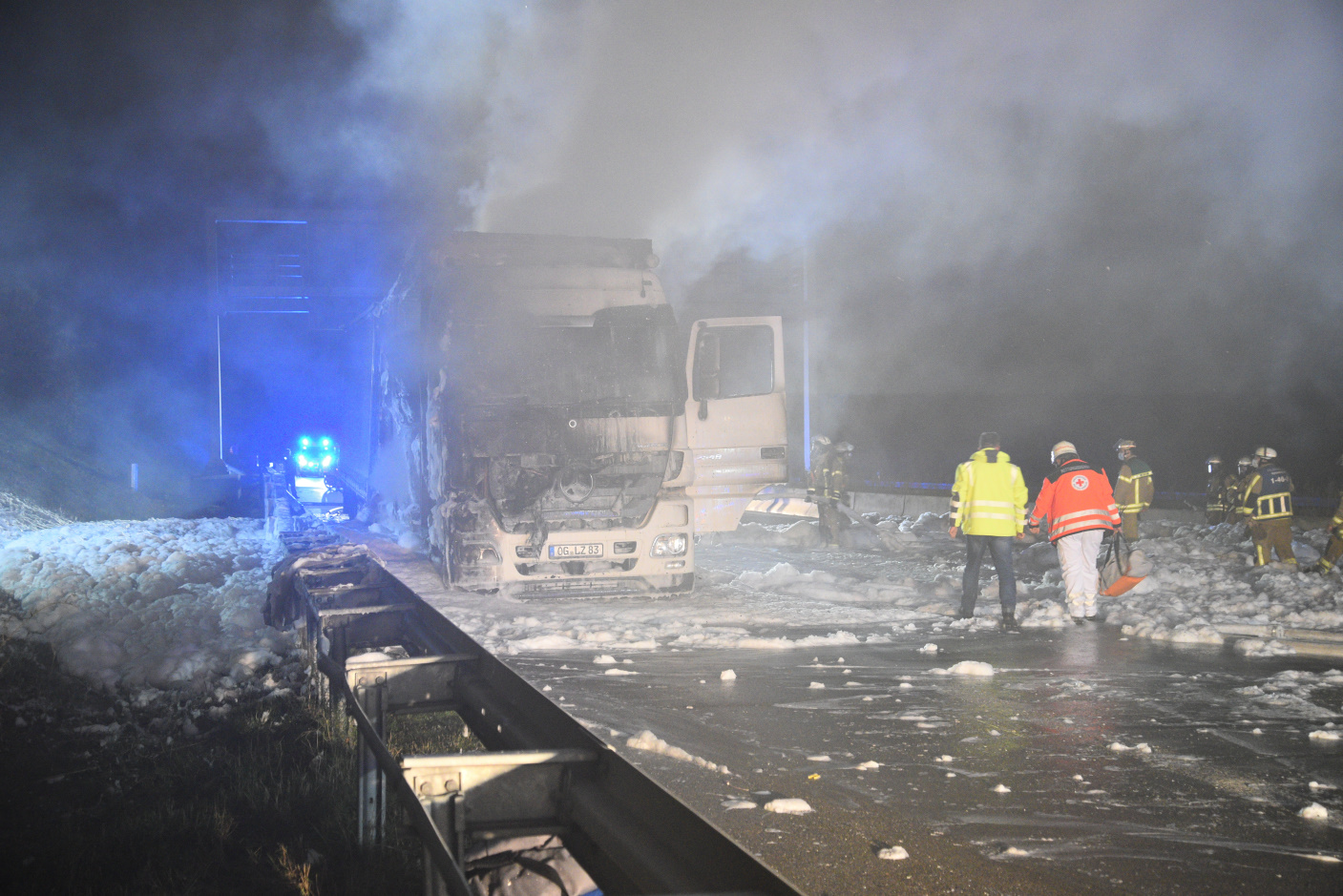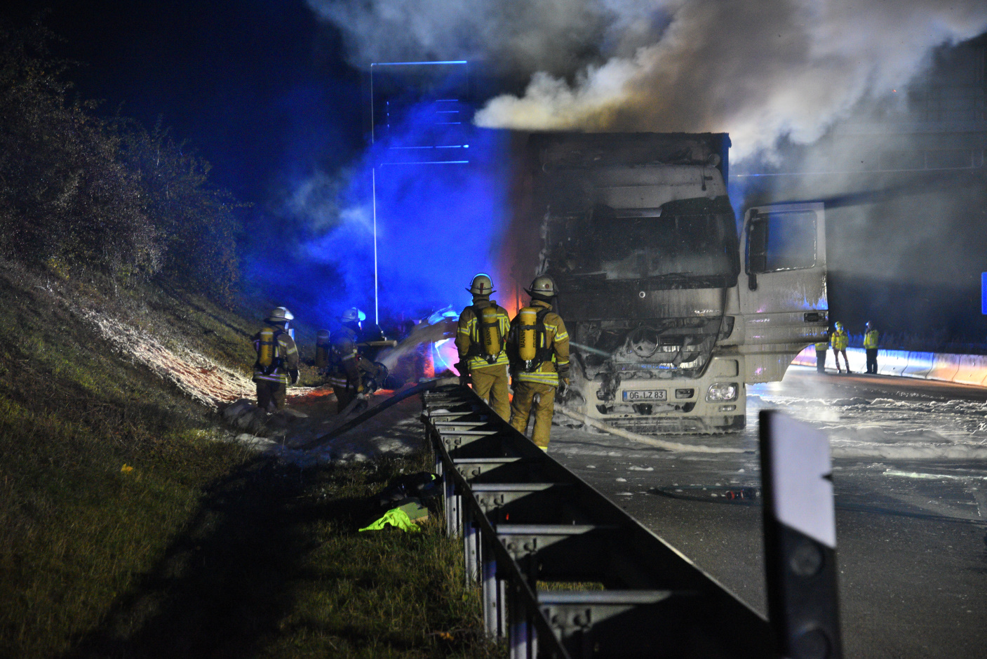 Stand 20.17 Uhr: Kurz vor 18 Uhr meldeten mehrere Verkehrsteilnehmer einen brennenden LKW auf der A6 auf dem Standstreifen zwischen dem Kreuz Mannheim und dem Viernheimer Kreuz. Nach ersten Erkenntnissen geriet das Fahrzeug im Bereich des Führerhauses während der Fahrt in Brand und griff dann auf den Anhänger über. Als der Fahrer des LKWs dies bemerkt hatte, hielt er sofort an. Da er Rauchgas einatmete befindet er sich derzeit vorsorglich in medizinischer Behandlung. Die Berufsfeuerwehr Mannheim, Rettungsdienst und Polizei sind mit einem Großaufgebot vor Ort. Es kommt nach wie vor zu starker Rauchentwicklung. Die Fahrbahnen zwischen den Autobahnkreuzen Mannheim und Viernheim sind zwecks Nachlösch-und Aufräumarbeiten weiterhin in beide Richtungen voll gesperrt. Die Brandursache ist derzeit noch unklar. Es kommt zu Rückstau in beiden Richtungen.