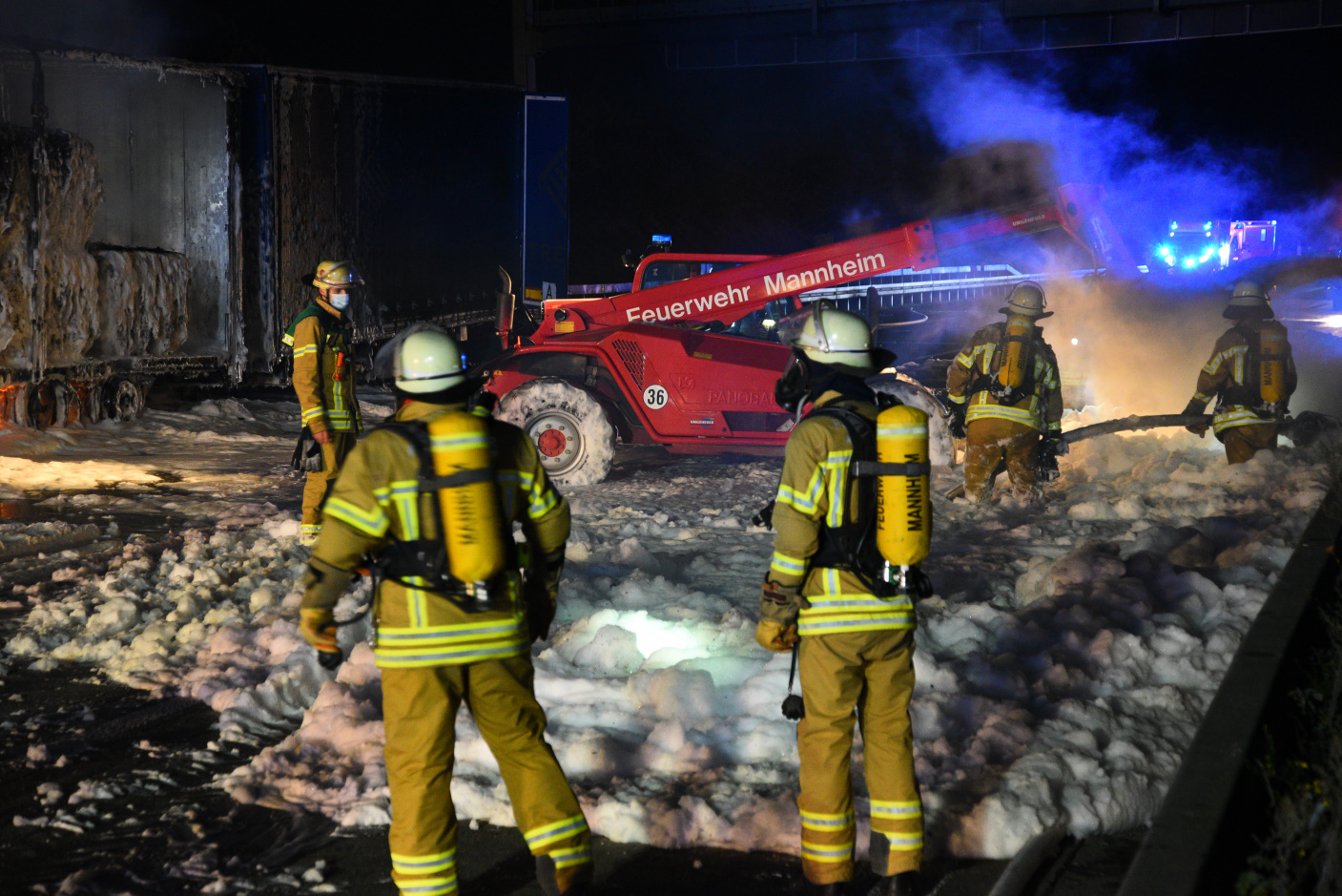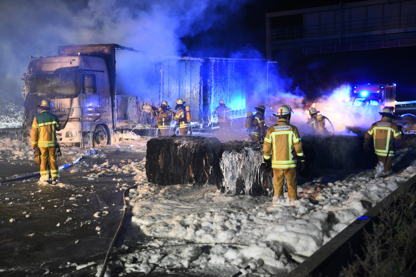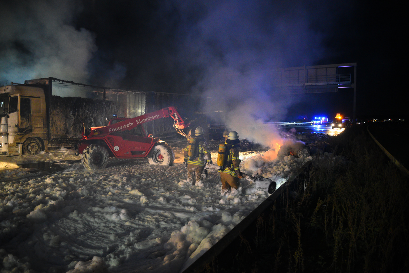 Update 21.10 Uhr: Nach Brand eines LKW-Zuges im Bereich Mannheim-Wallstadt ist die Fahrbahn zwischen dem ABK Viernheim und ABK Mannheim in Richtung Heilbronn wieder frei befahrbar. Der Fahrer des LKW-Zuges wurde nach ambulanter medizinischer Behandlung vor Ort entlassen. Der Schaden an LKW und Anhänger wird auf ca. 130.000 Euro geschätzt. Der Verkehr in Richtung Frankfurt/ Saarbrücken wird momentan entgegen der Fahrtrichtung zum ABK Mannheim ausgeleidet. Die Bergungsmaßnahmen werden noch bis in die frühen Morgenstunden fortdauern.
