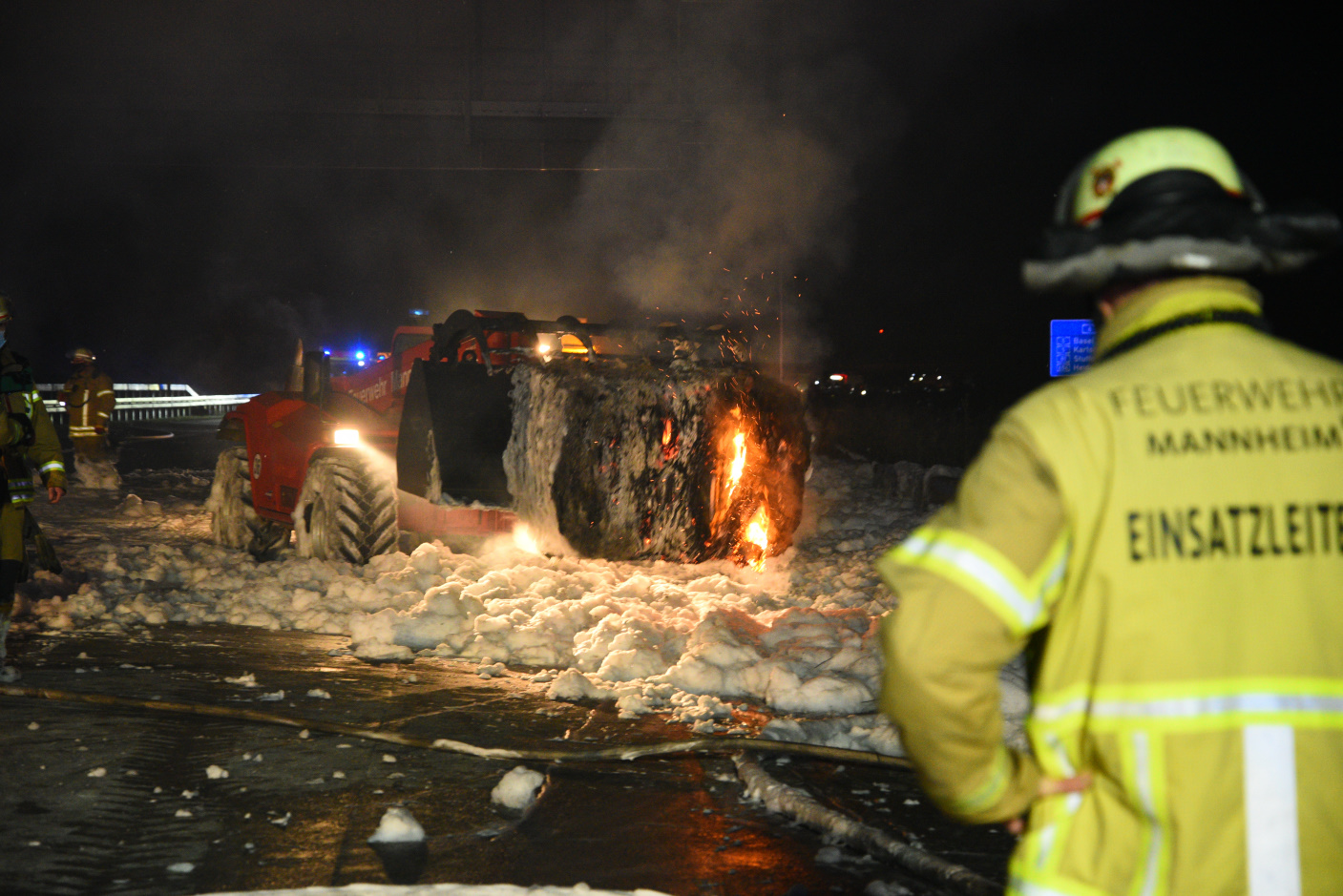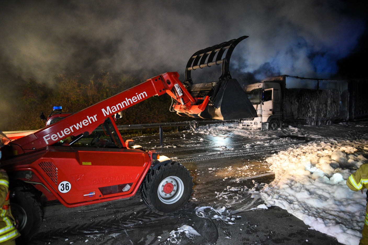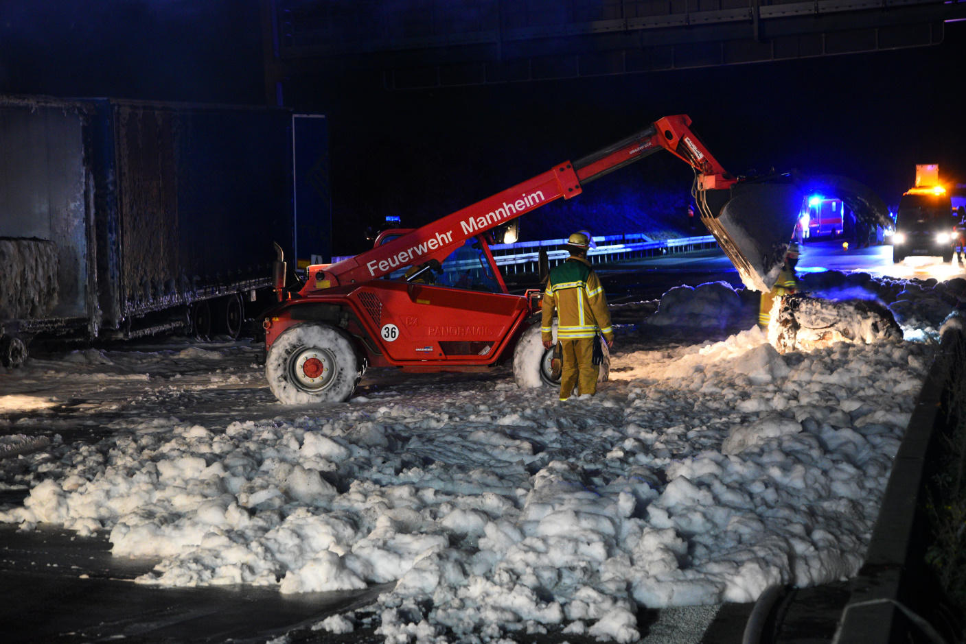 Update 21.10 Uhr: Nach Brand eines LKW-Zuges im Bereich Mannheim-Wallstadt ist die Fahrbahn zwischen dem ABK Viernheim und ABK Mannheim in Richtung Heilbronn wieder frei befahrbar. Der Fahrer des LKW-Zuges wurde nach ambulanter medizinischer Behandlung vor Ort entlassen. Der Schaden an LKW und Anhänger wird auf ca. 130.000 Euro geschätzt. Der Verkehr in Richtung Frankfurt/ Saarbrücken wird momentan entgegen der Fahrtrichtung zum ABK Mannheim ausgeleidet. Die Bergungsmaßnahmen werden noch bis in die frühen Morgenstunden fortdauern.