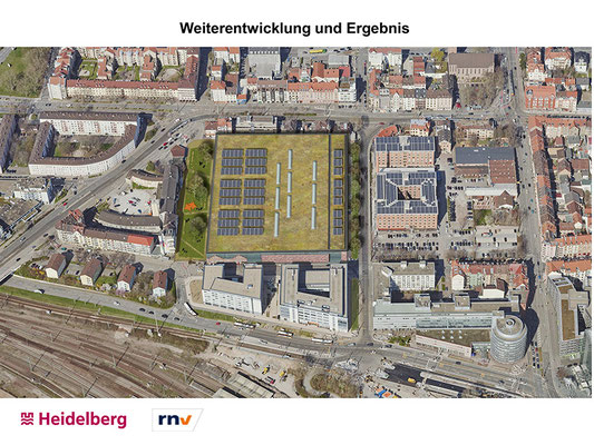 Die vorgeschlagene Planung sieht den Neubau des Betriebshofs am Altstandort an der Bergheimer Straße vor, mit Platz für 30 Busse und 32 Bahnen. Die Abstellflächen liegen im geschlossenen Betriebshofsgebäude, das verringert den Lärm für die Anwohnerinnen und Anwohner. Die Ein- und Ausfahrt ist entlang der Karl-Metz-Straße vorgesehen. Eine zusätzliche Ein- und Ausfahrt über die Alte Eppelheimer Straße Richtung Czernyring wäre optional möglich. Wichtiges Merkmal ist die neue rund 25 mal 150 Meter große Grünfläche unter Einbeziehung der Emil-Maier-Straße – ein künftiger neuer Treffpunkt im Stadtteil, etwa so groß wie der Werderplatz in Neuenheim. Für das benachbarte Areal Richtung Czernyring, auf dem heute das Dezernat 16 steht, sind weiterhin alle Nutzungsoptionen möglich. So besteht die Möglichkeit, hier ein attraktives, imagebildendes Kreativquartier mit Gewerbeflächen und Wohnungsbau zu entwickeln. Zusätzlich ist eine öffentliche Nutzung im Erdgeschoss des rnv-Gebäudes entlang der Karl-Metz-Straße geplant, etwa in Form einer öffentlichen Kantine.