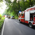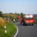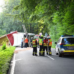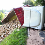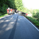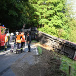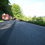 Der 40-Tonner war mit Holzscheiten beladen, die bei dem Unfall neben der Fahrbahn landeten. Für die Aufräumarbeiten ist die Landstraße aktuell noch immer gesperrt.
